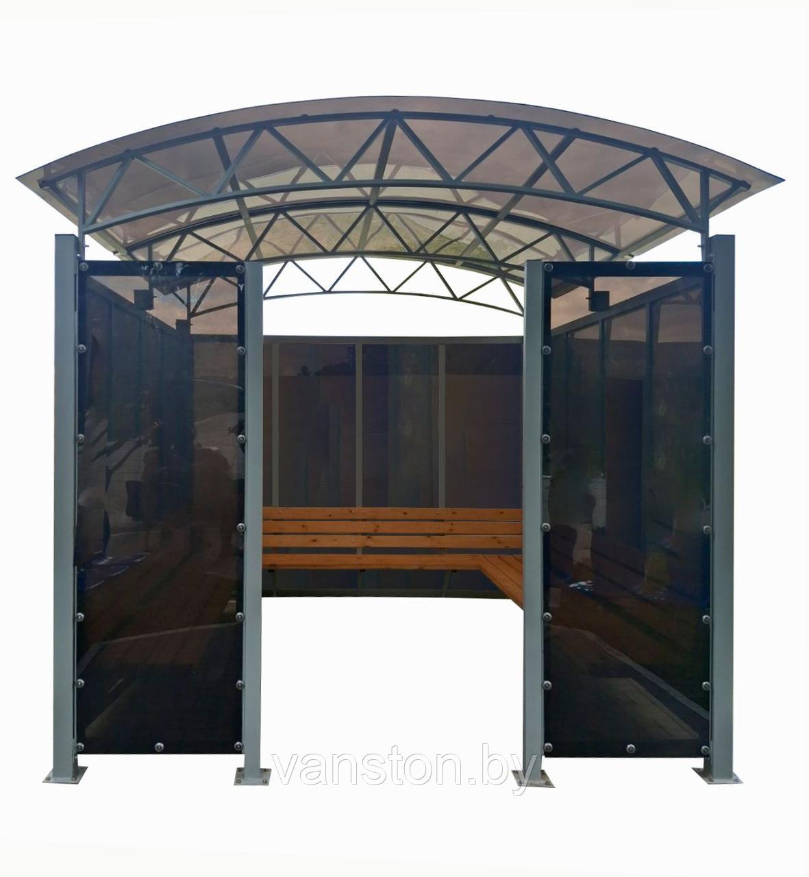 Используемые материалы: Труба 80*80*3мм, труба 60*40*2мм, труба 40*40*2мм, монолитный поликарбонат 6мм, брус 40мм*90мм(скамейка).